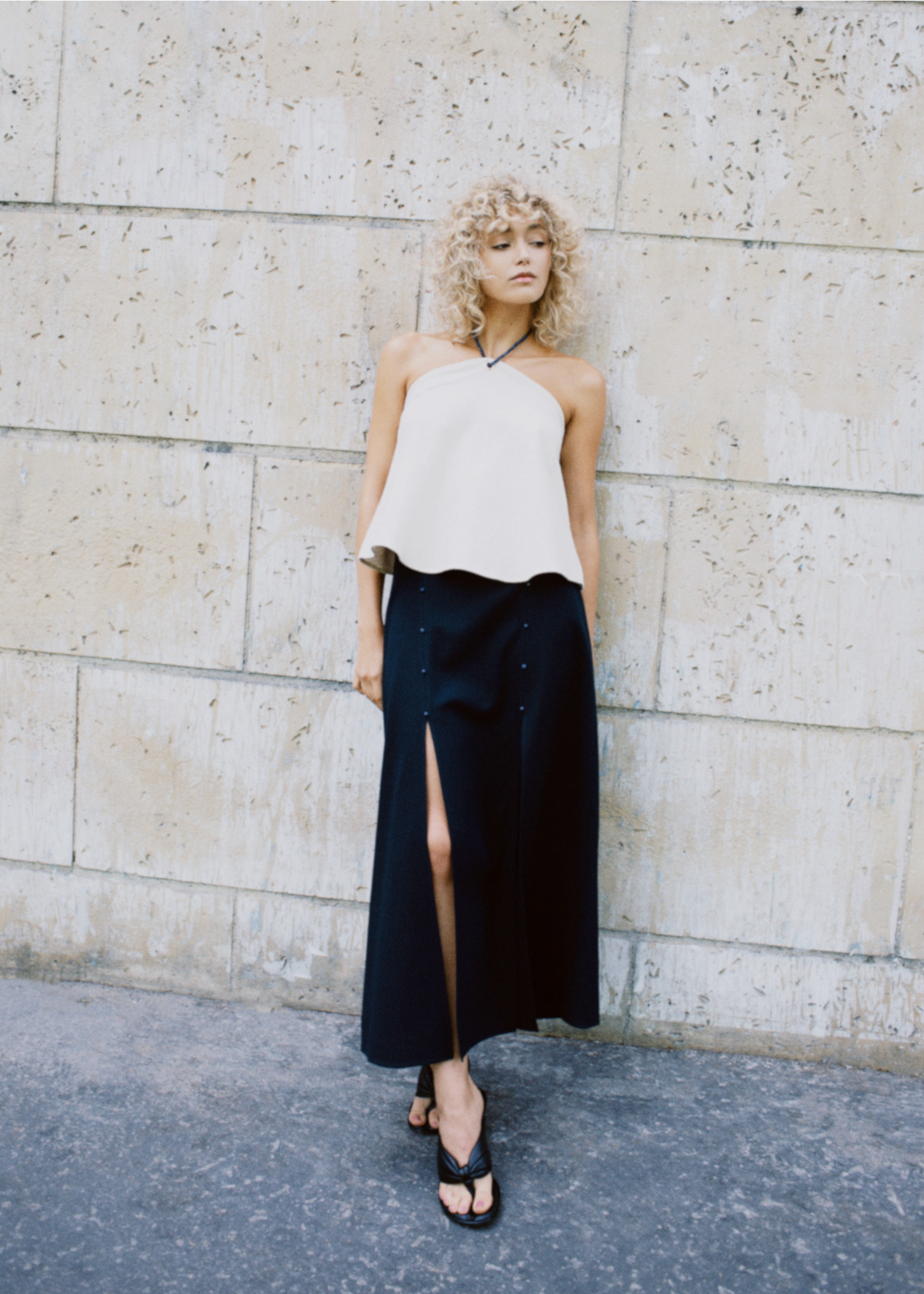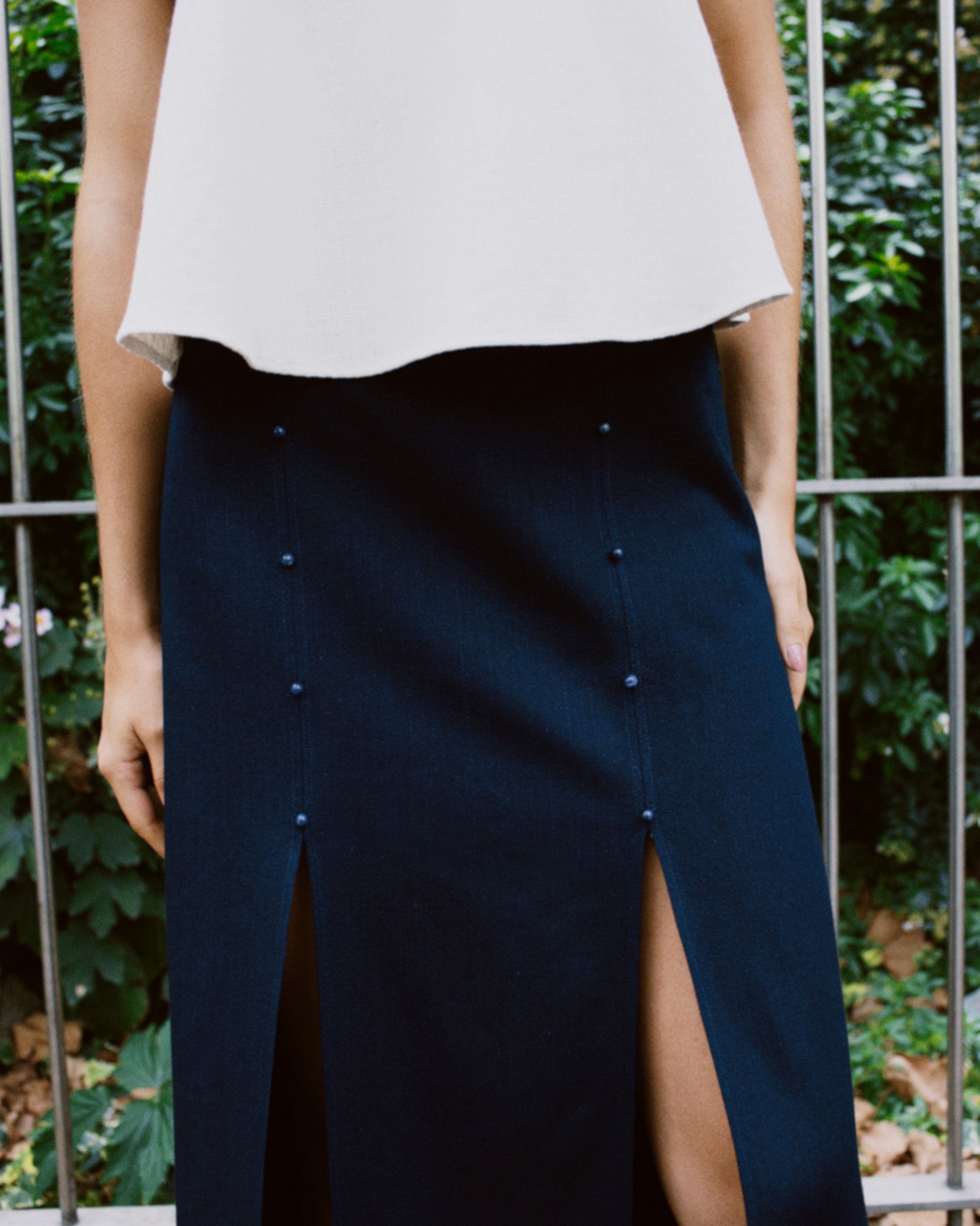 Torquay skirt subtly reveals your legs at the slightest movement with its two slits on the front. Midi length, it is easy to wear and flatters all body types. High waist with a slightly trapeze volume, it hugs your curves without marking them. It has an invisible zip concealed in the side seam.