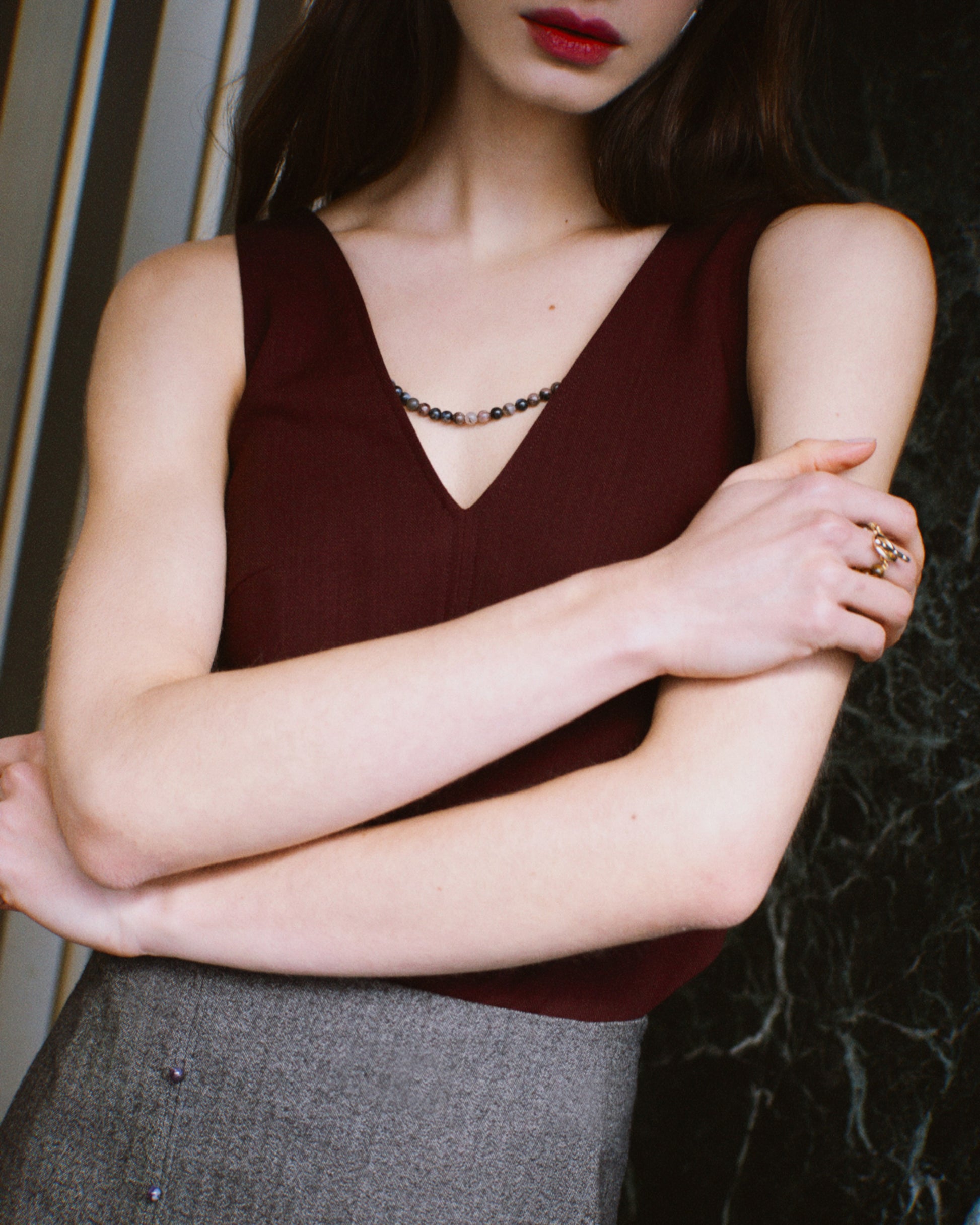 Votre top Bells s'accompagne d'un collier amovible. En pierres fines naturelles, il est couronné de fermoirs dorés en France à l'or fin 24 carats. Véritable bijou du quotidien, ce collier peut se convertir au gré de vos envies en bracelet en glissant simplement les fermoirs menottes l'un dans l'autre autour de votre poignet. Vous êtes invitées à vous laisser guider par votre instinct et choisir la variété de pierre fine qui vous séduit parmi notre sélection. Rendez-vous dans l'onglet "Nos pierres fines" ci-dessous afin d'en apprendre davantage sur leurs vertus spécifiques et leurs signes astrologiques de prédilection.